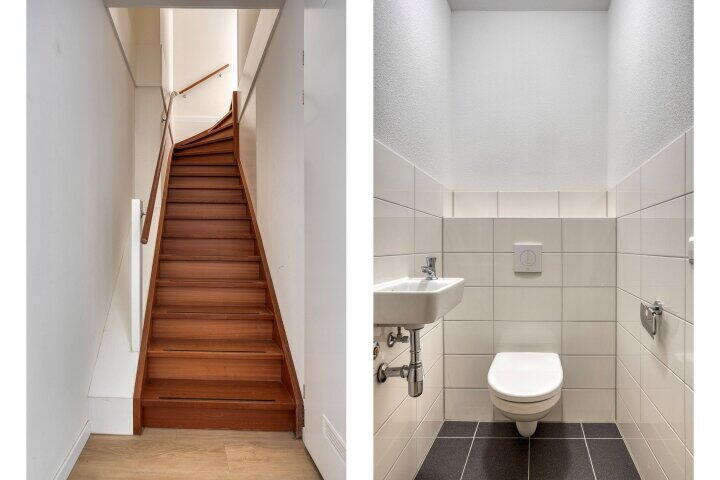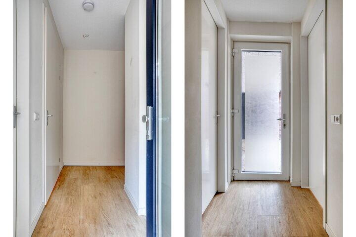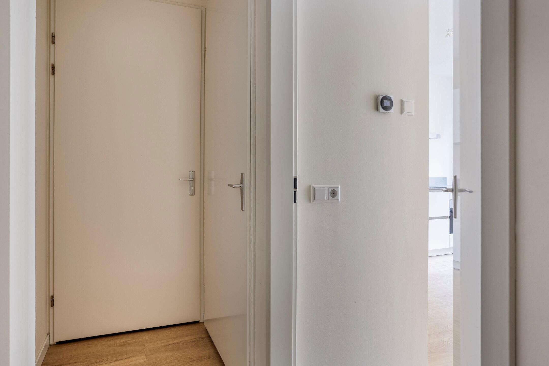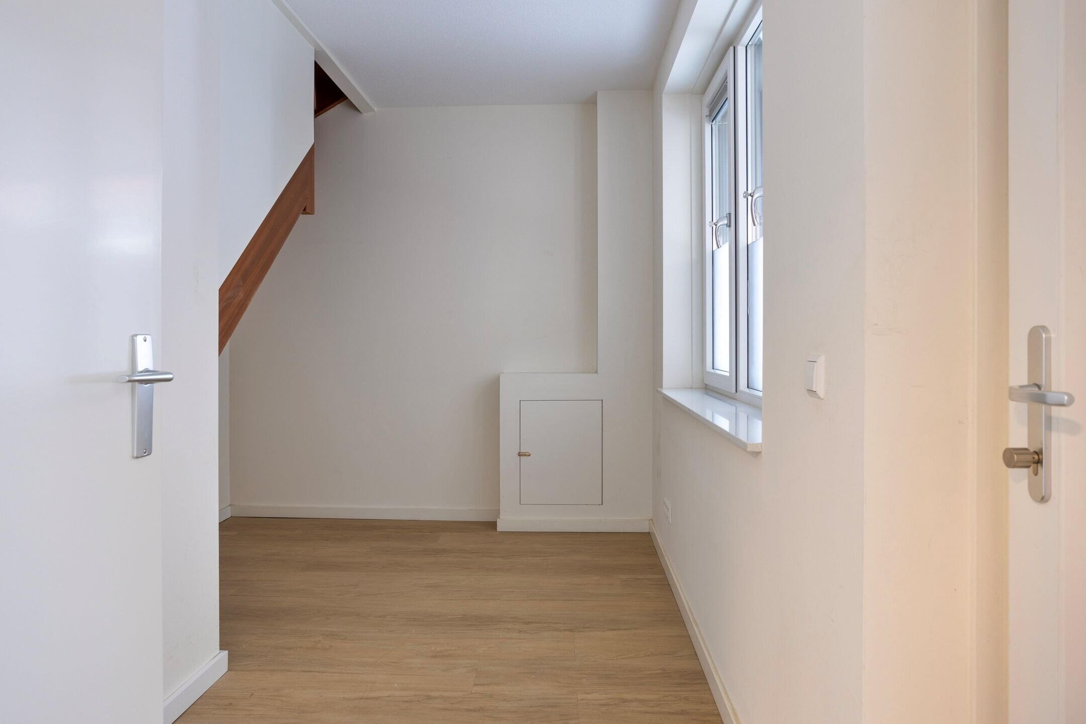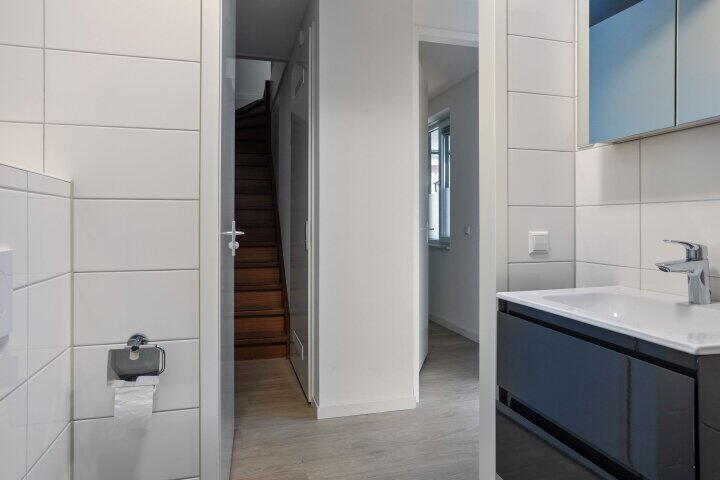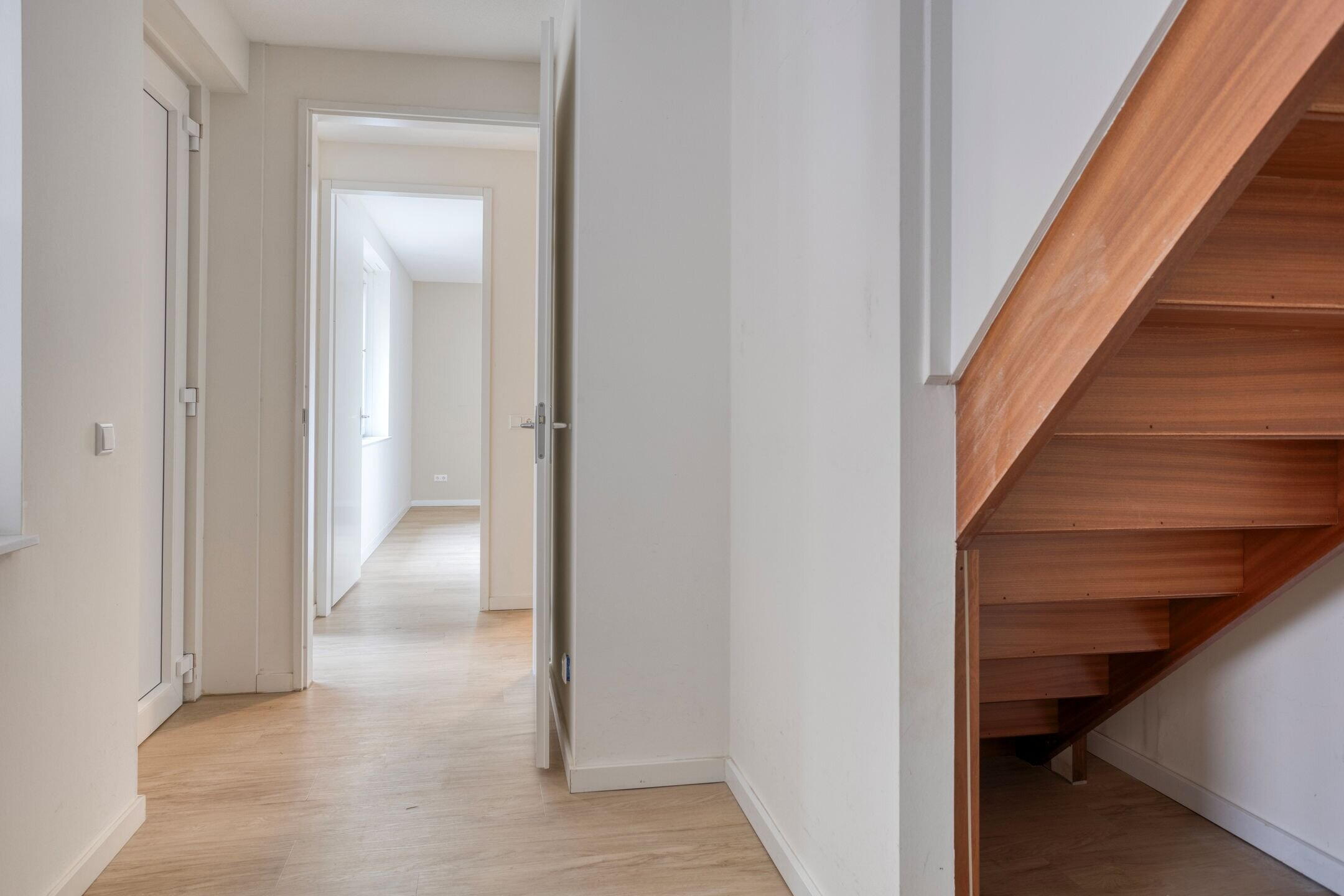 Dit instapklare appartement biedt met zijn ca. 62 m² woonoppervlakte een verrassend praktische en comfortabele indeling. Via de eigen entree kom je binnen in de hal op de begane grond. Hier bevinden zich de twee slaapkamers en de moderne badkamer, voorzien van douchecabine, wastafelmeubel, designradiator, toilet én aansluitingen voor wasmachine en droger. Ook is er een aparte trapopgang naar de eerste verdieping.